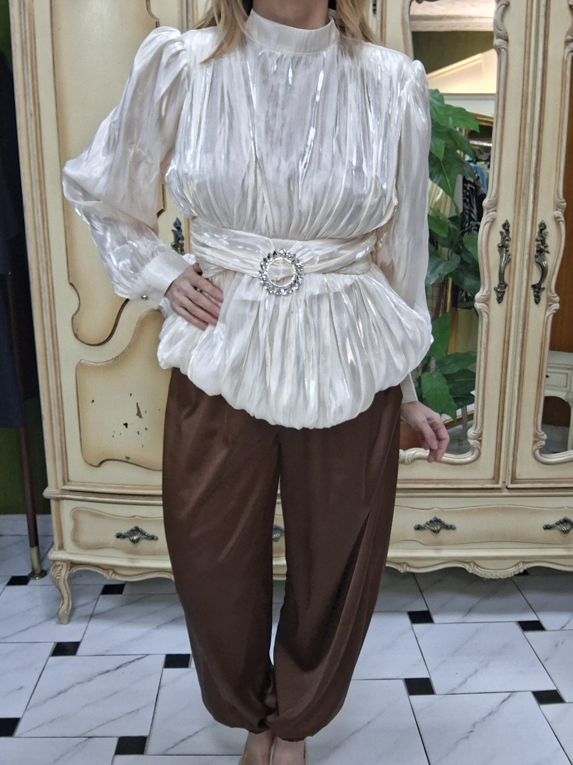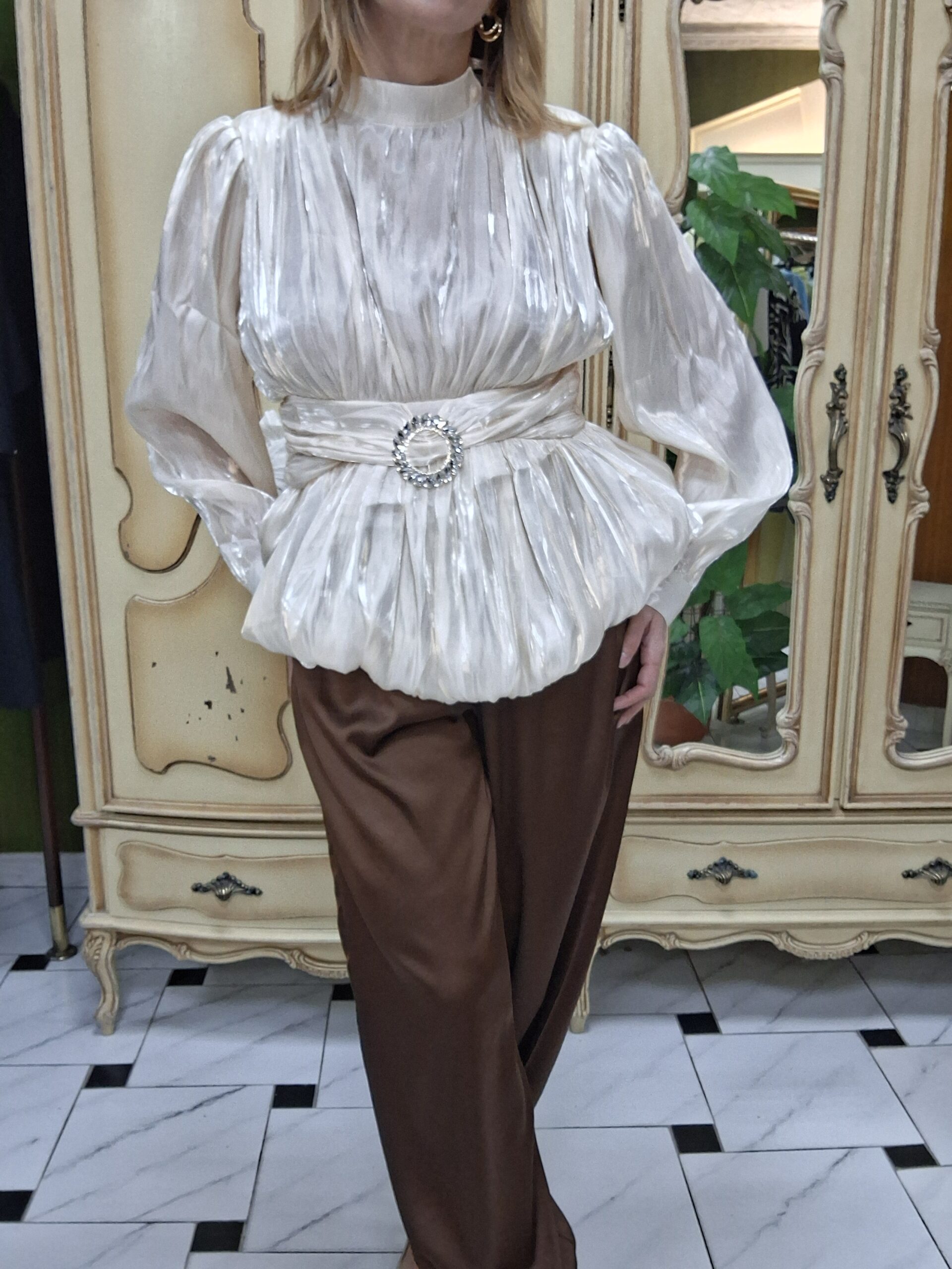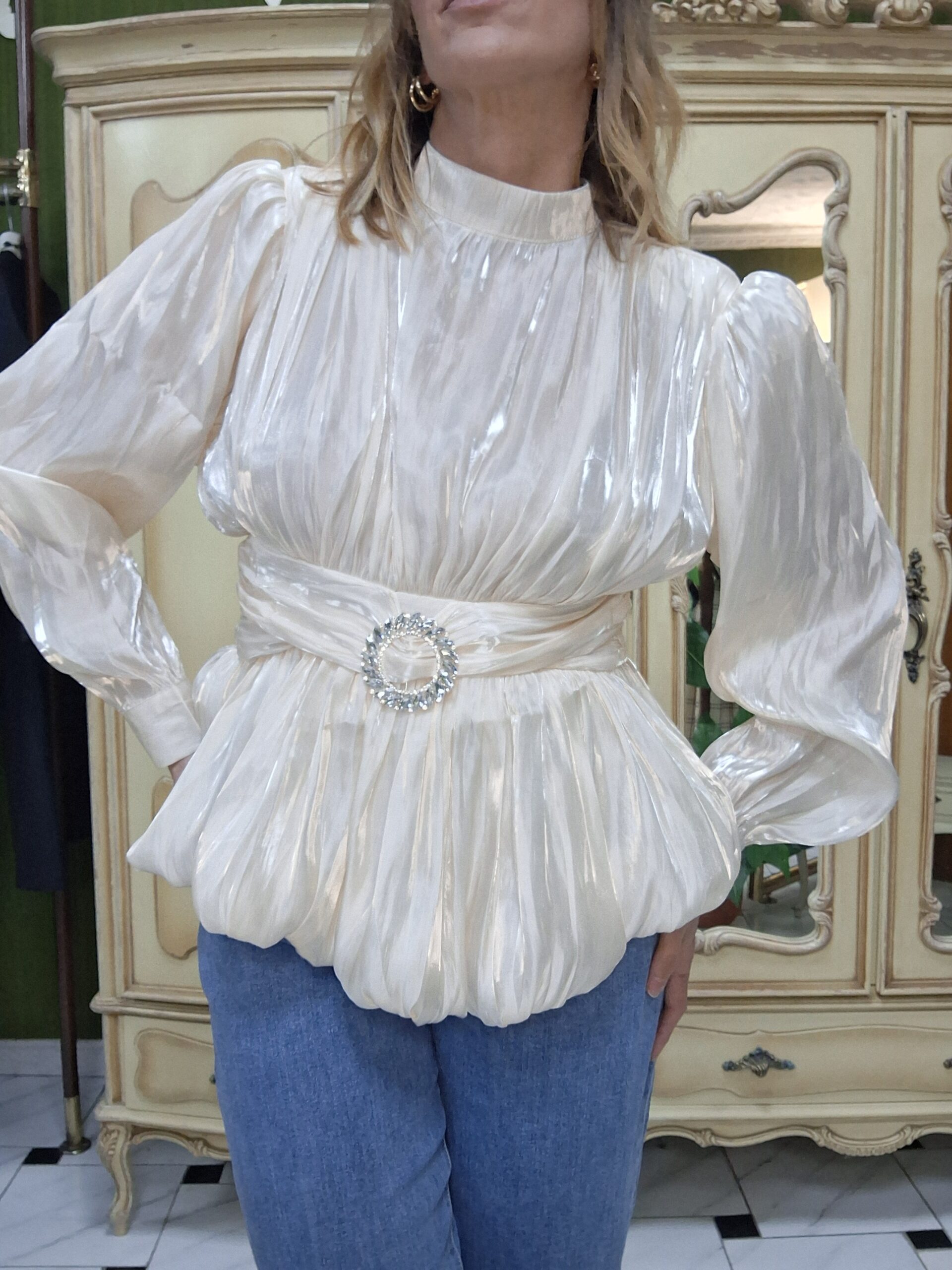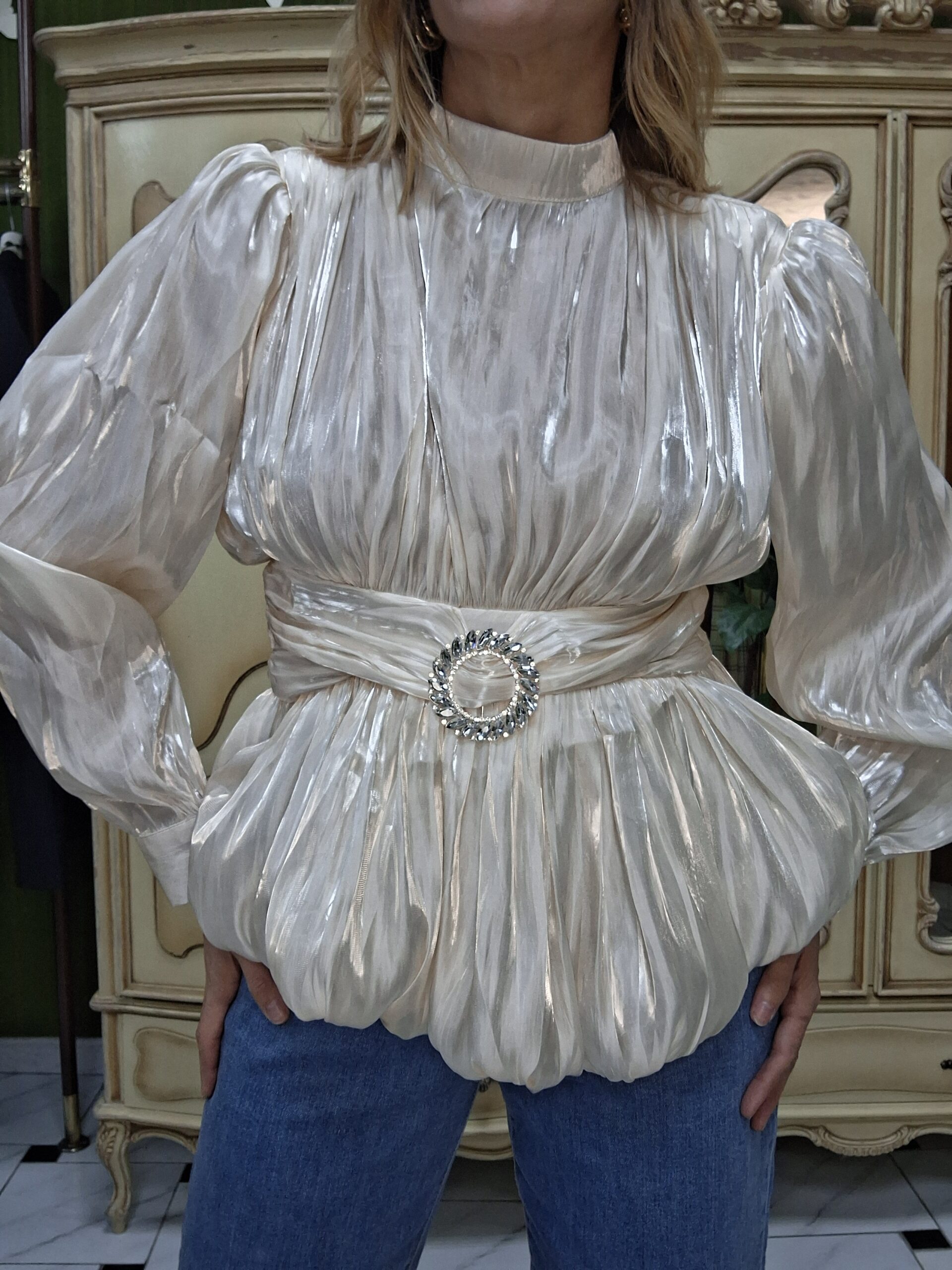 Eleva tus looks de temporada con esta blusa de mujer perfecta para celebraciones especiales de primavera, una prenda elegante y con estilo que combina tendencia y sofisticación. Su corte globo y mangas farol aportan volumen y movimiento, creando una silueta moderna y favorecedora.