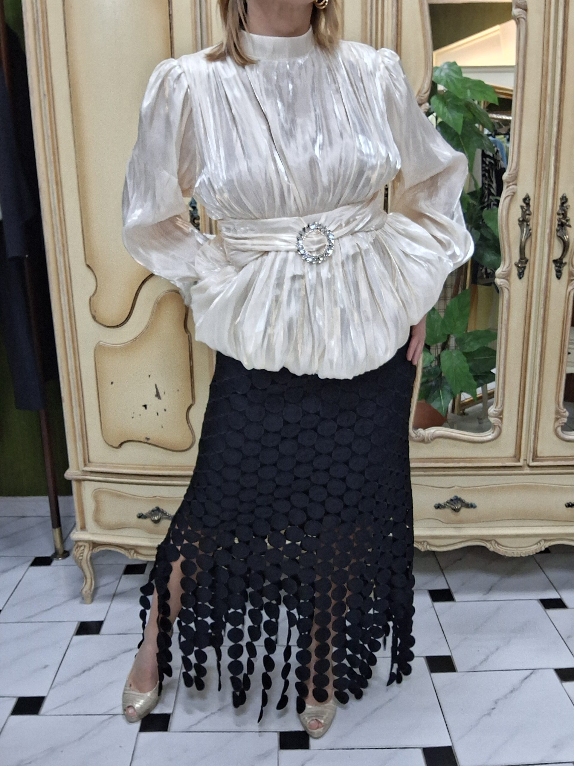 Las hombreras añaden estructura y definen la figura, mientras que la cremallera en la espalda facilita el ajuste y mantiene un acabado limpio. El broche en la cintura resalta la silueta, aportando un detalle distintivo y elegante que marca la diferencia en cualquier outfit.