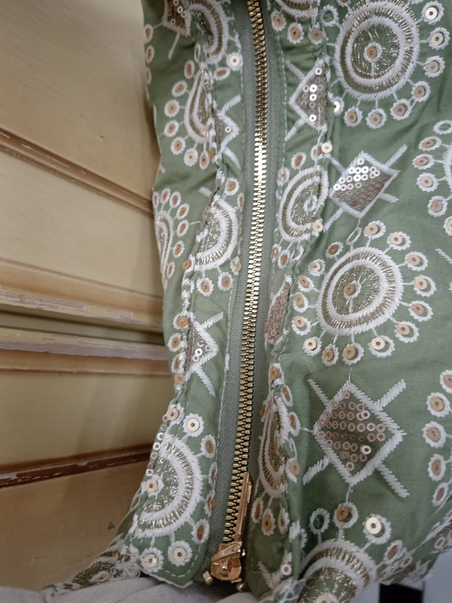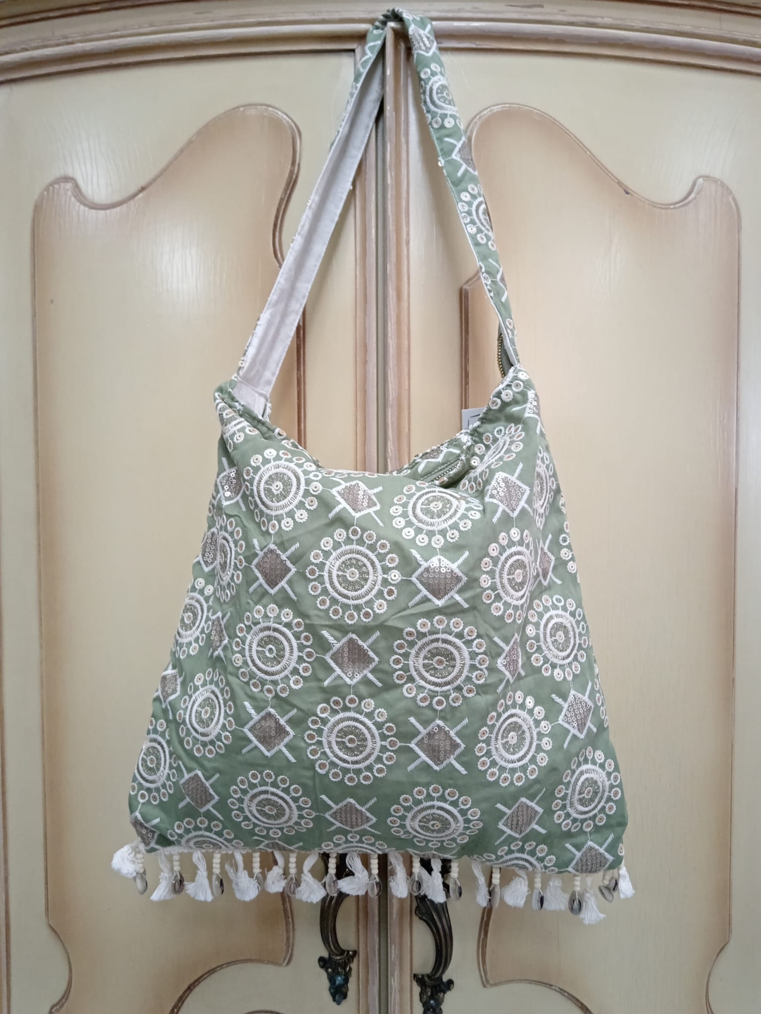 Bolso de tela en color verde militar con adornos en color beige y cierre de cremallera