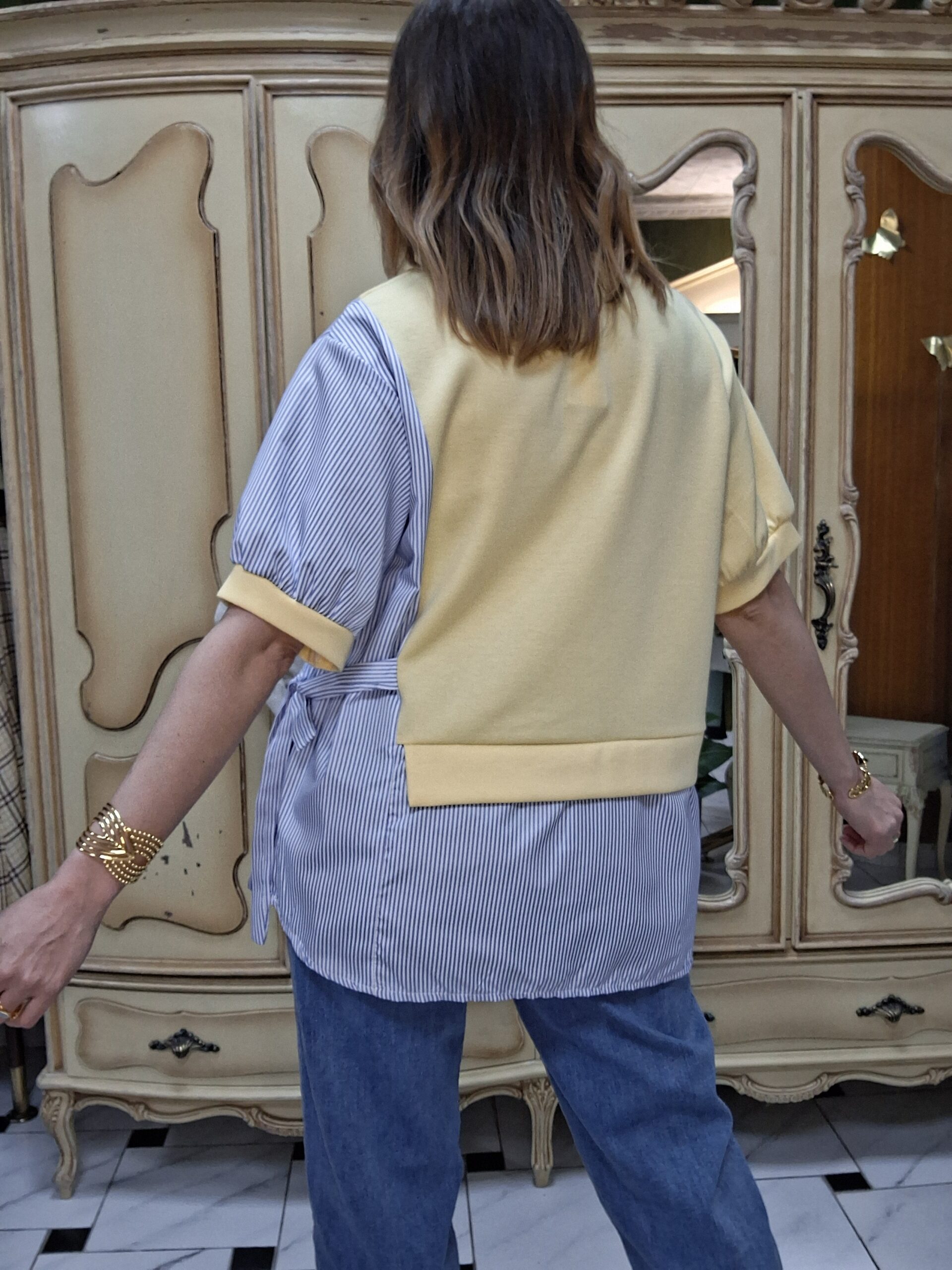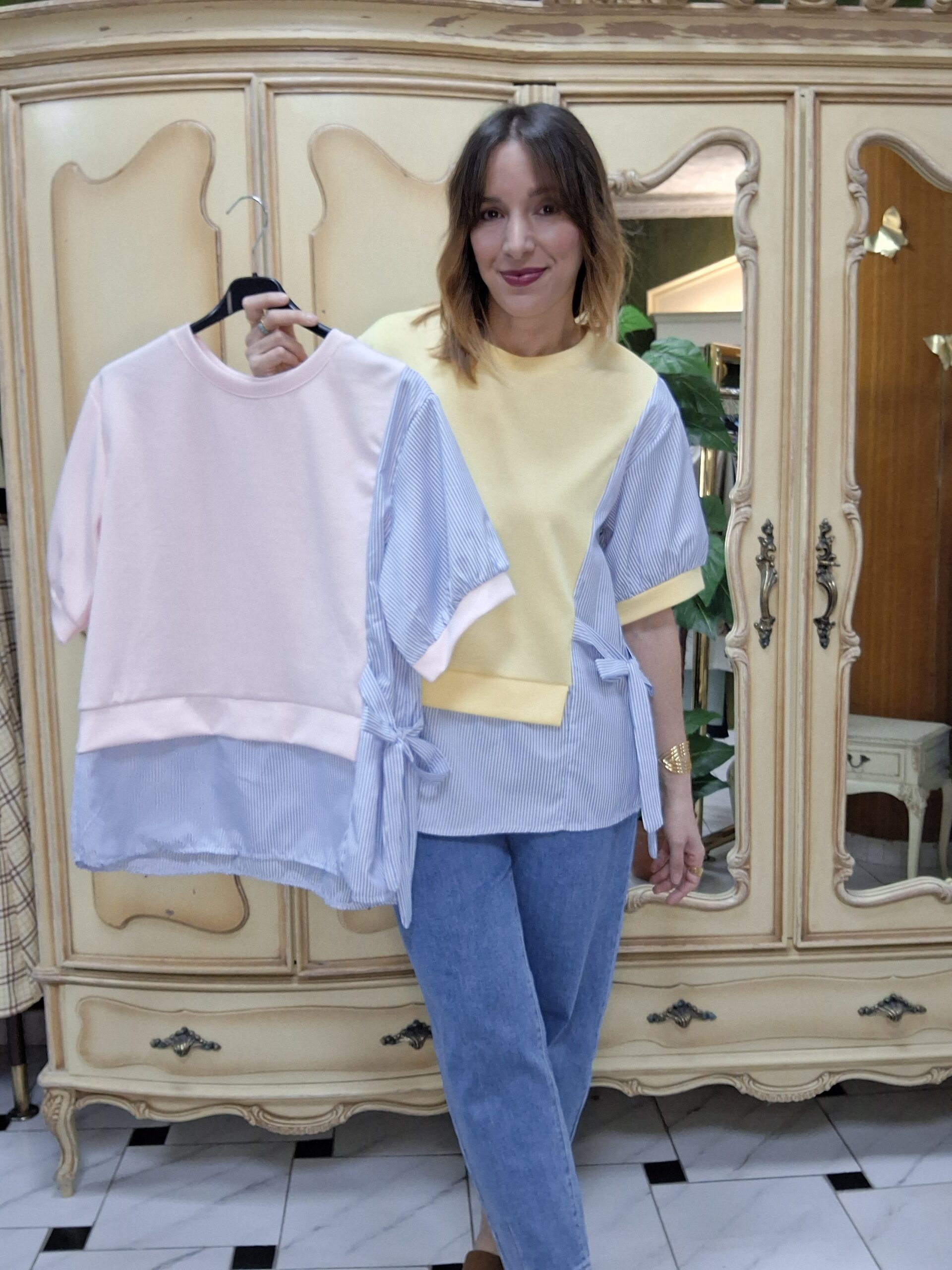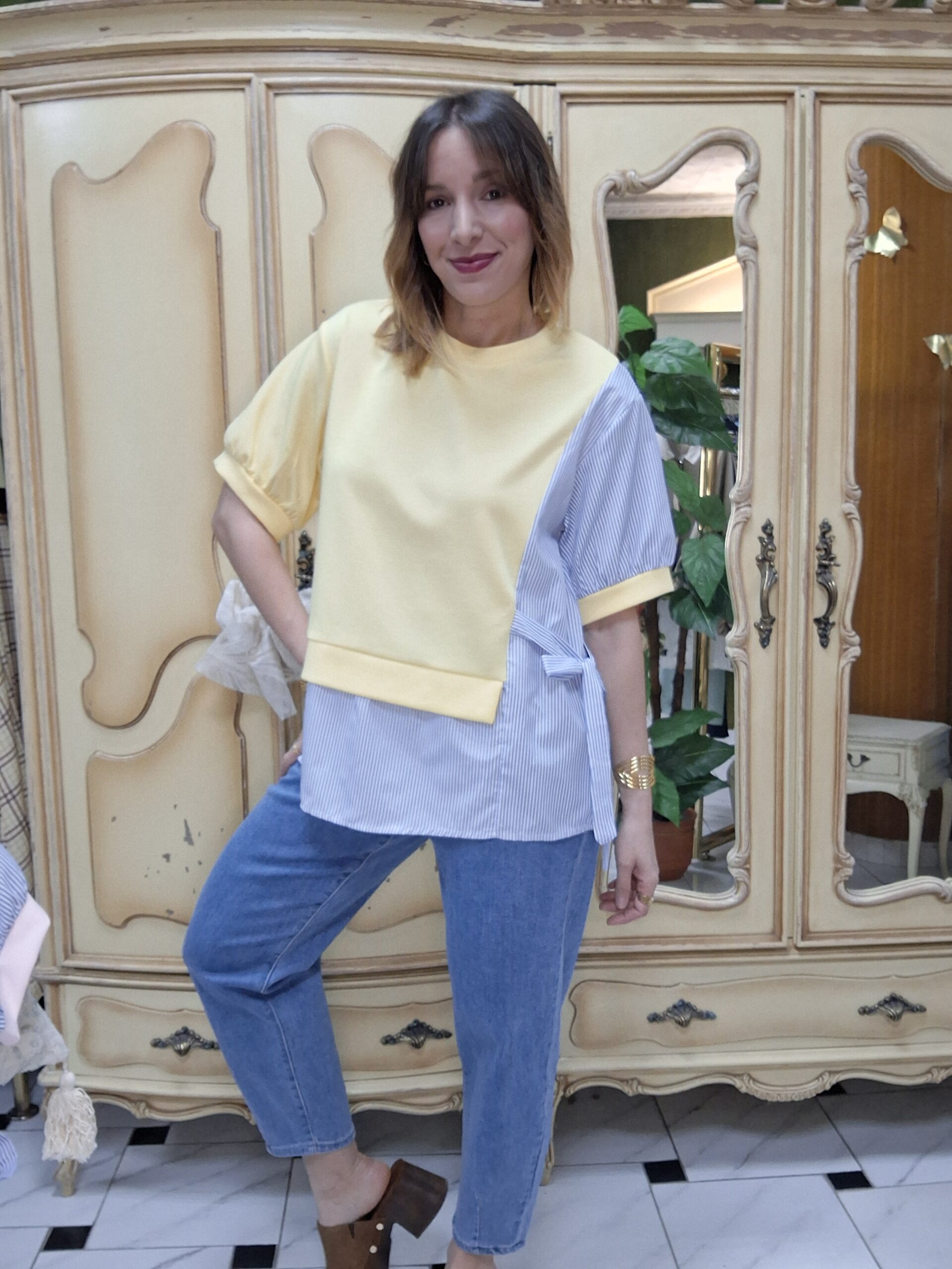 Este diseño mitad camiseta y mitad camisa aporta un estilo casual con un toque diferente, ideal para combinar con jeans, pantalones casuales o faldas y crear looks frescos y versátiles. Su corte cómodo y ligero la convierte en una prenda perfecta para la temporada primavera-verano.