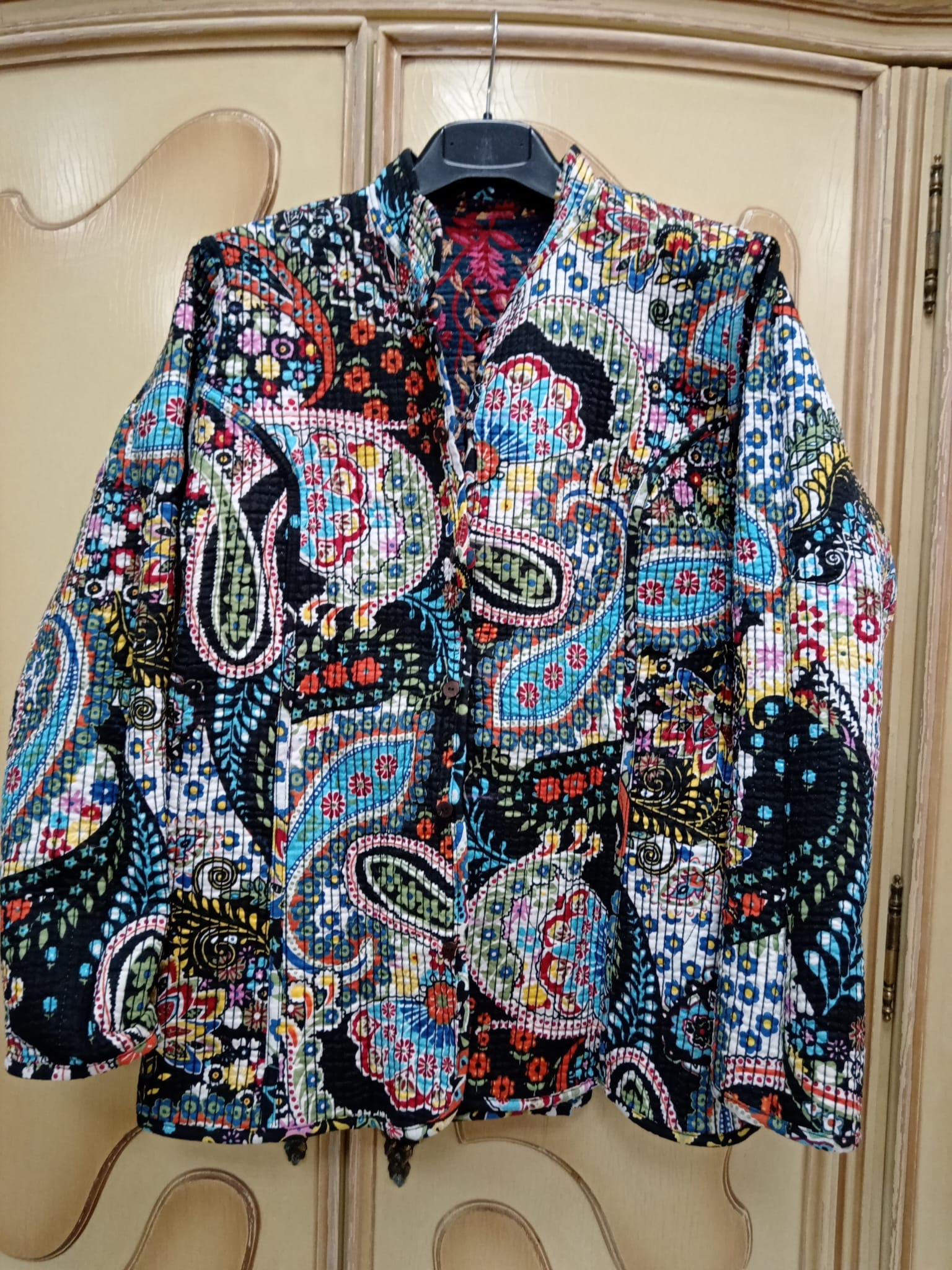 Chaqueta reversible de mujer con un diseño versátil y lleno de personalidad. Presenta estampados alegres, bonitos y diferentes que aportan un toque único a cualquier look. Por un lado, cuenta con botones forrados en el mismo tejido, creando un acabado elegante y armonioso; por el otro, incorpora botones de madera que añaden un estilo más natural y casual. Perfecta para combinar en distintas ocasiones, esta chaqueta reversible ofrece dos estilos en una sola prenda, destacando por su originalidad, comodidad y atención al detalle. Ideal para quienes buscan moda femenina diferente, funcional y con encanto.