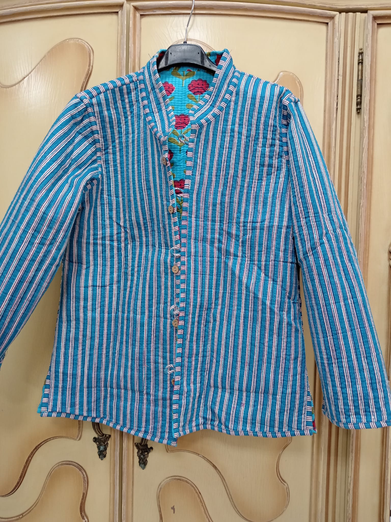 Chaqueta reversible turquesa flores rojas
