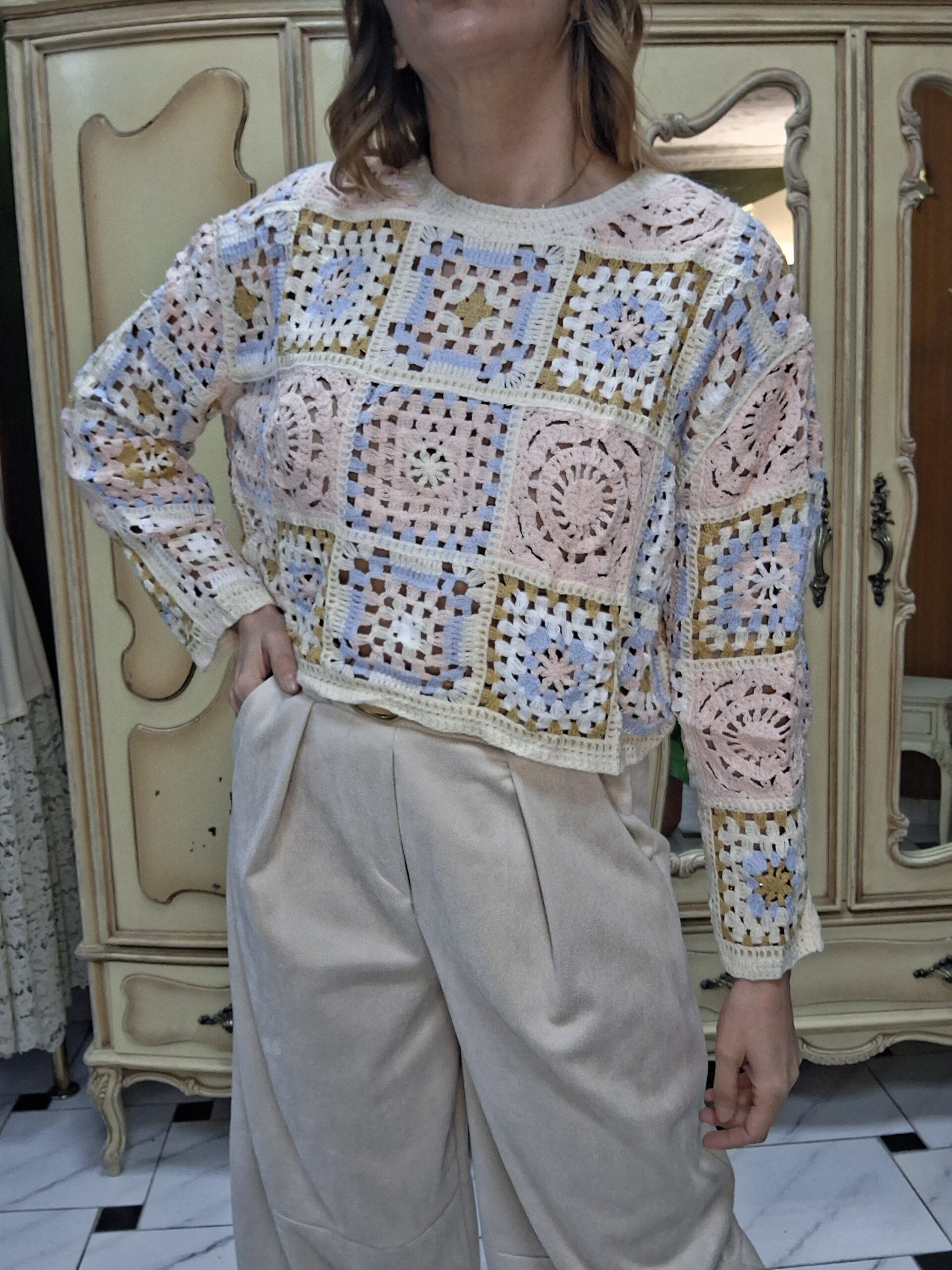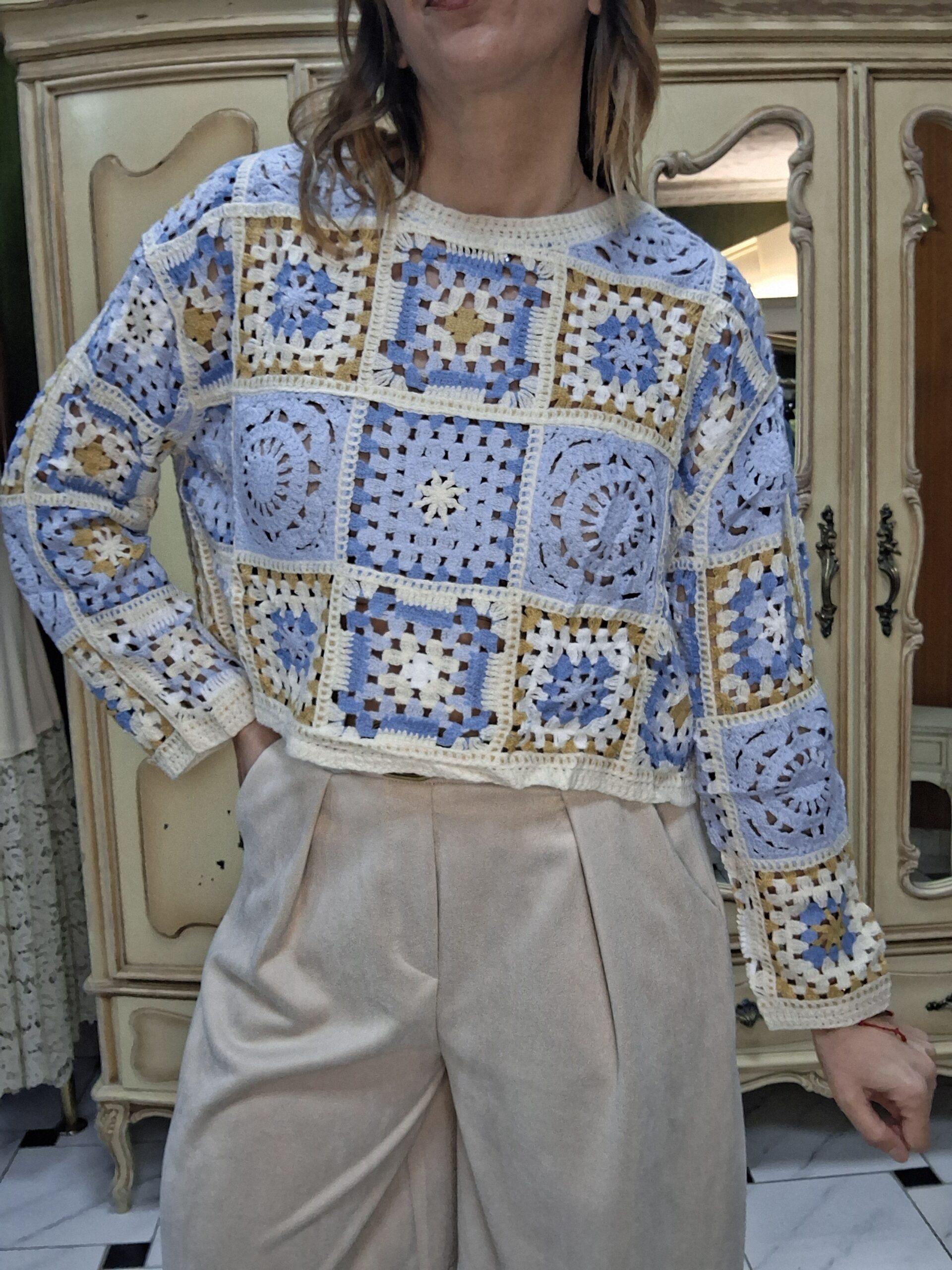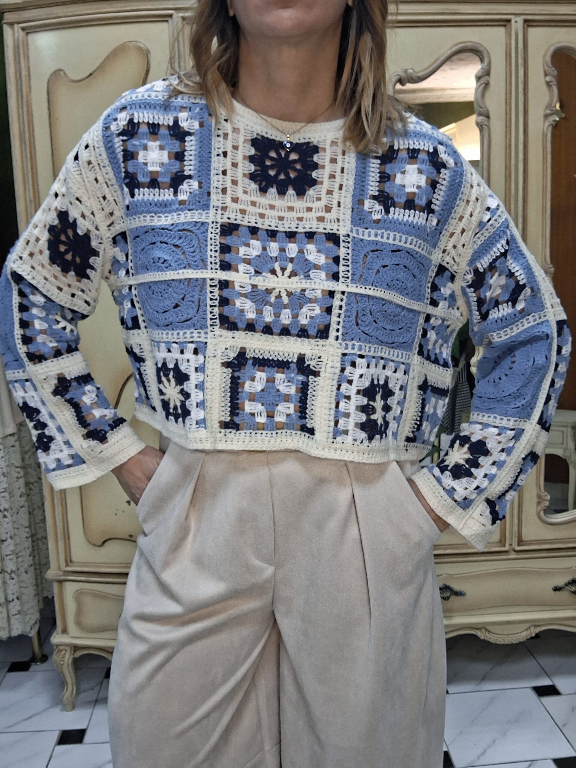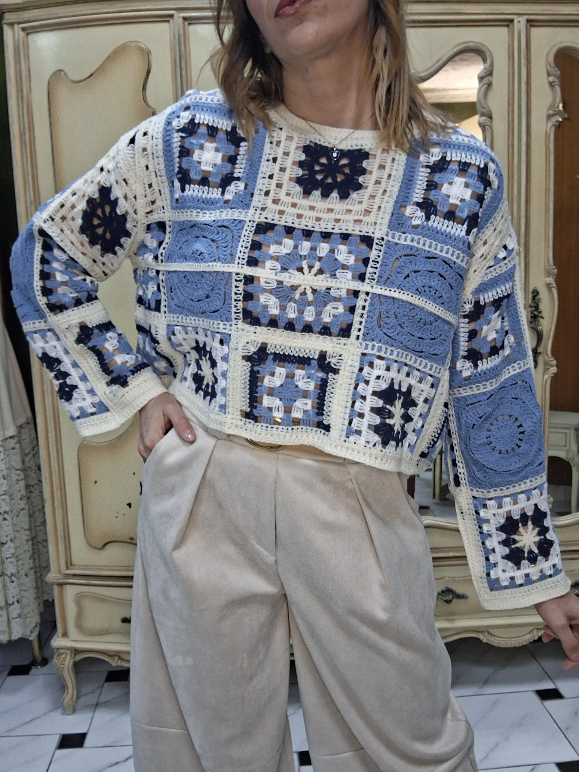 Jersey de crochet para mujer, una prenda imprescindible que combina estilo artesanal y tendencia. Su diseño tejido en crochet aporta un aire bohemio y elegante, perfecto para crear looks únicos y con personalidad. Con un acabado ligero y transpirable, este jersey es ideal para entretiempo o para añadir un toque especial a cualquier conjunto. Su versatilidad permite combinarlo fácilmente con jeans, faldas o vestidos, adaptándose tanto a estilos casuales como más sofisticados. Un básico renovado que destaca por su textura y detalles delicados.