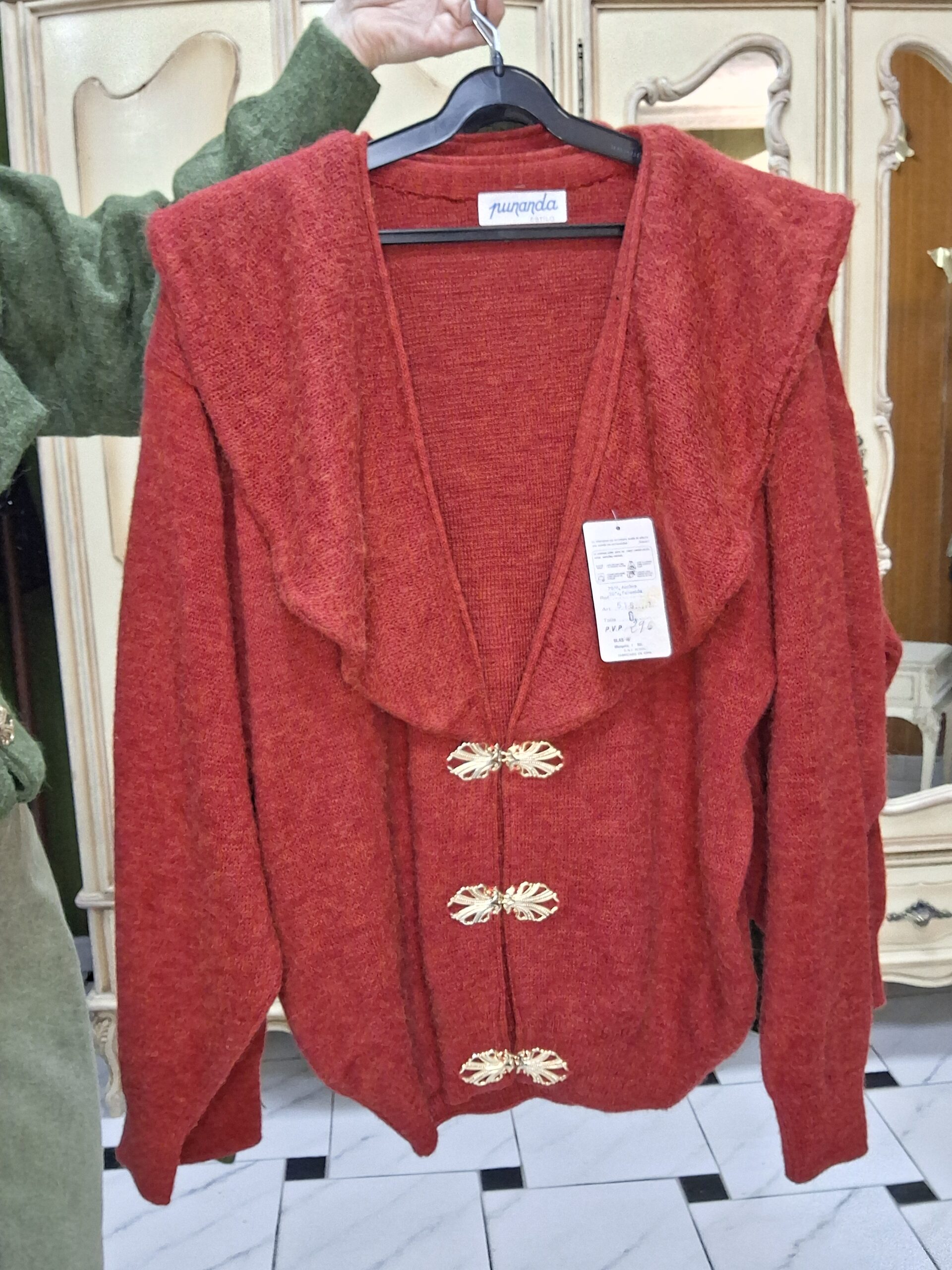 Rebecona original de los años 90, nueva a estrenar y con etiqueta original de la época. Confeccionada en lana de alta calidad, destaca por sus solapas grandes estilo noventero, hombreras estructuradas que realzan la silueta y broches dorados que aportan un toque elegante y sofisticado.