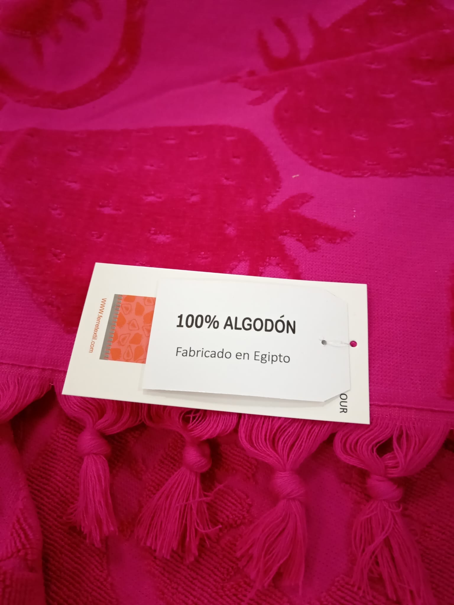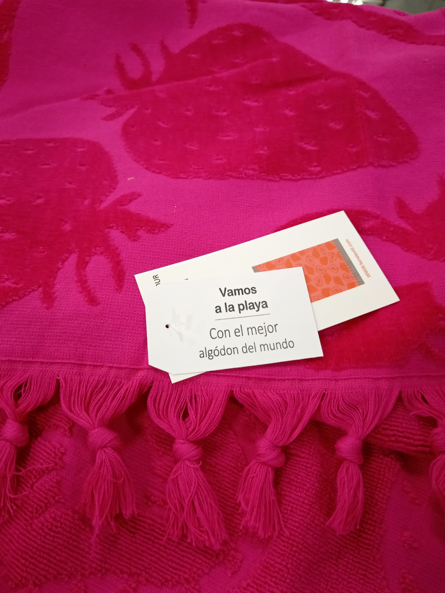 Toalla de playa color fucsia. Tejido de terciopelo haciendo dibujos de fresitas. Tamaño grande y 100% algodón