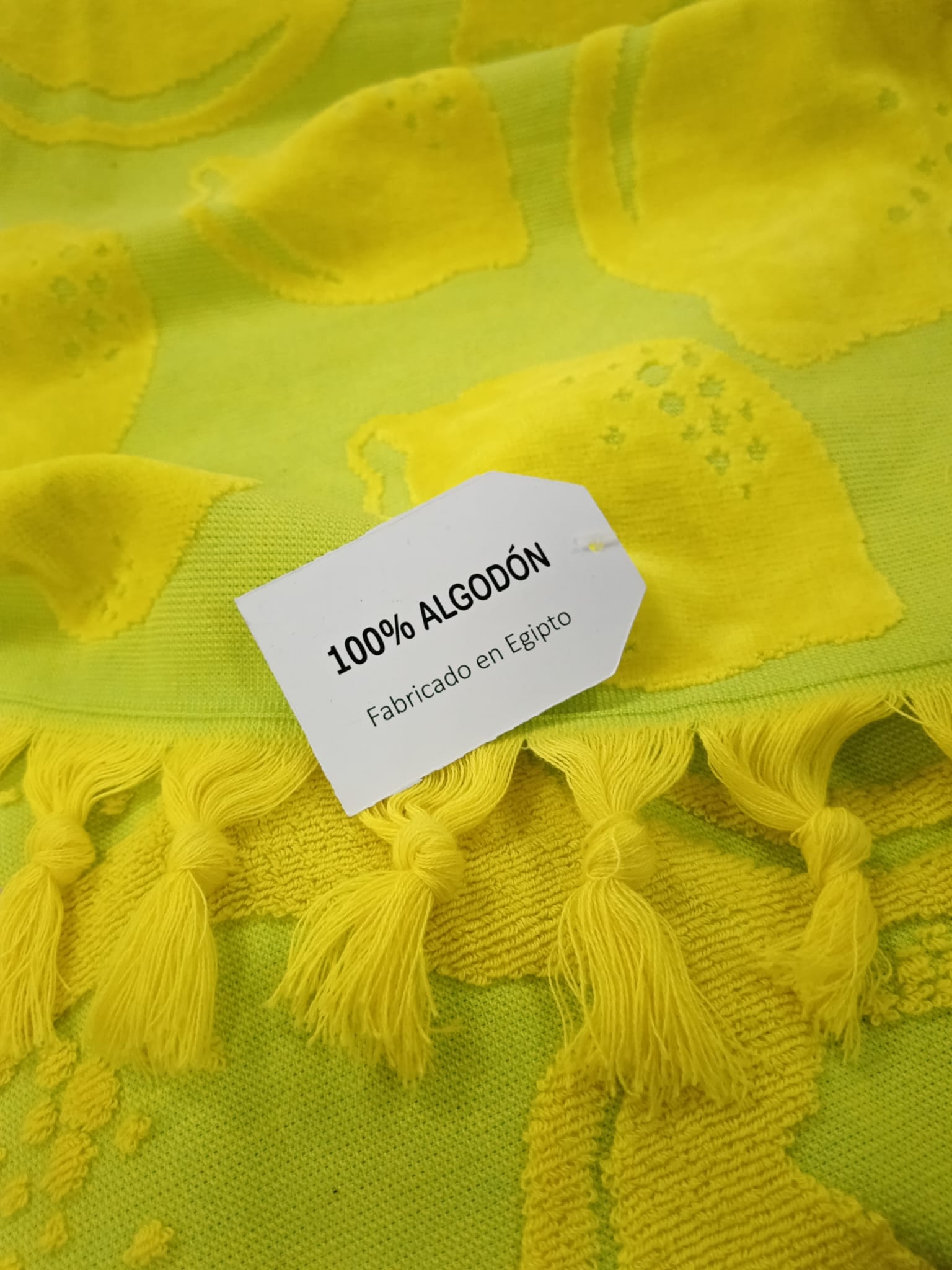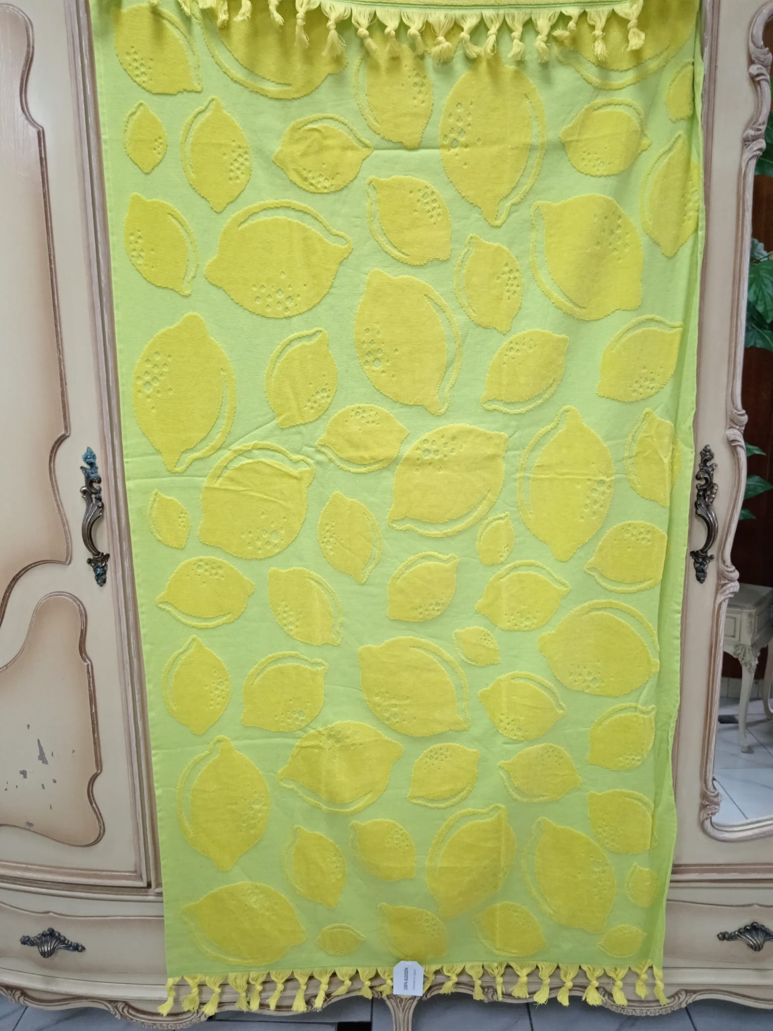 Toalla de playa color amarillo y verde. Tejido de terciopelo haciendo dibujos de limones. Tamaño grande y 100% algodón