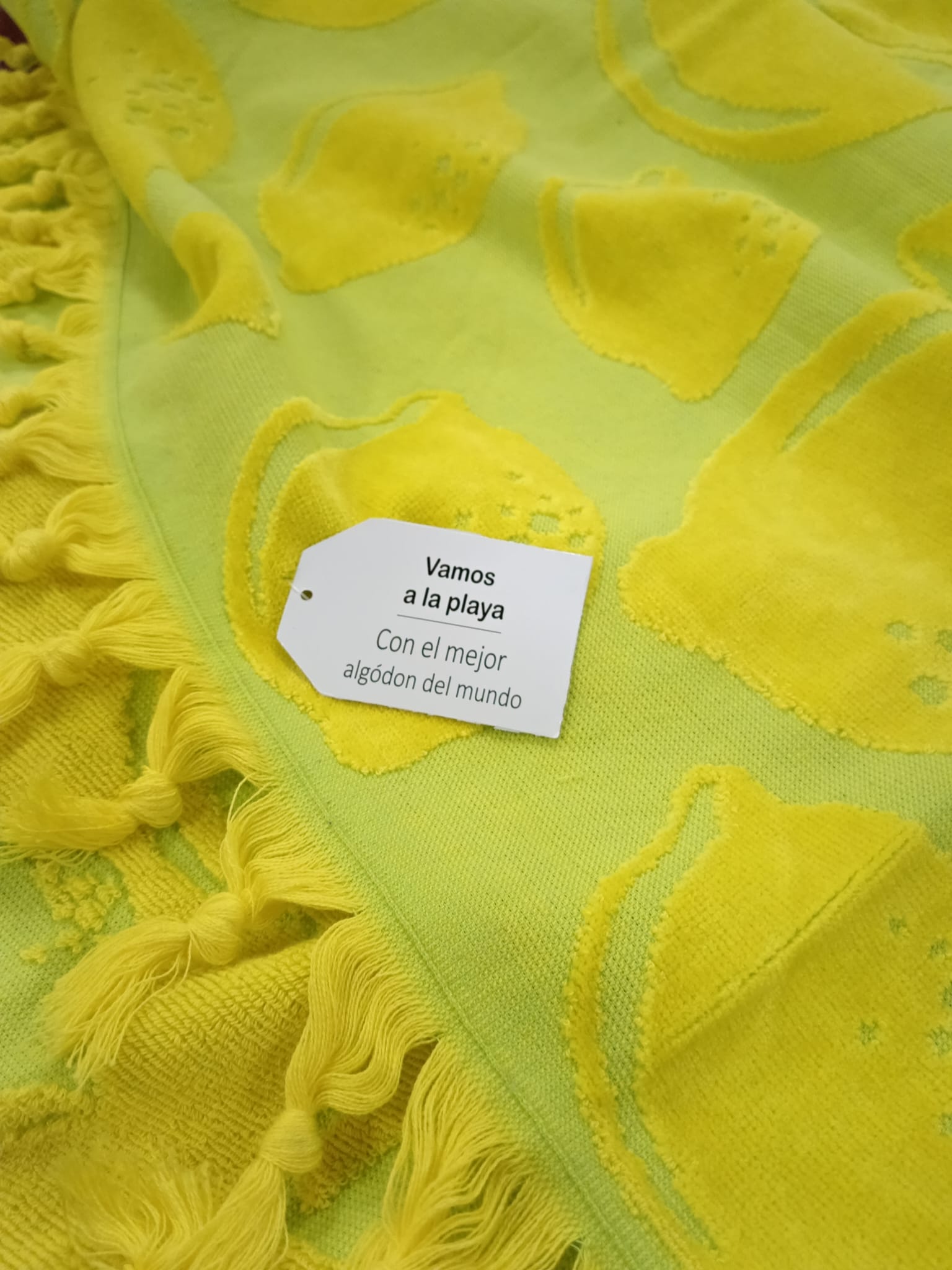 Toalla de playa color amarillo y verde. Tejido de terciopelo haciendo dibujos de limones.